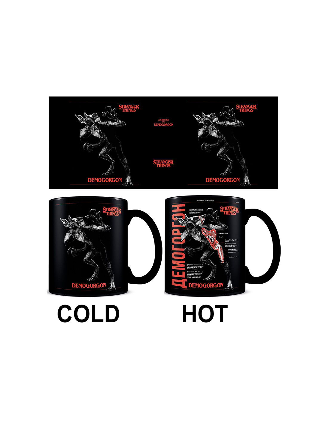 Taza termosensible con asa. · Fabricada con cerámica. · Con capacidad para 315 ml. · El diseño varía cuando se vierte líquido caliente en su interior. · No es recomendable utilizar microondas y lavavajillas. · Se entrega en una caja de cartón totalmente cerrada. · Con licencia oficial de STRANGER THINGS.