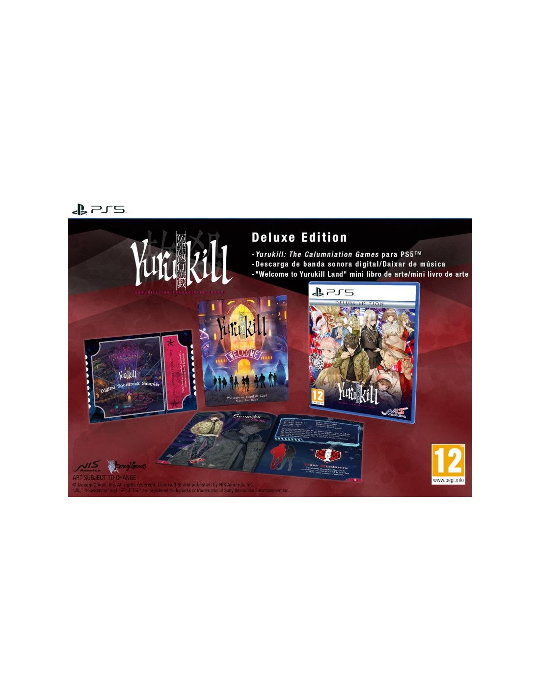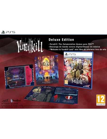 DELUXE EDITION: -¡Cada copia de Yurukill: The Calumniation Games Deluxe Edition viene con un código de descarga digital de la banda sonora del juego además de un libreto de arte de tapa blanda que destaca el trasfondo y arte de personajes!