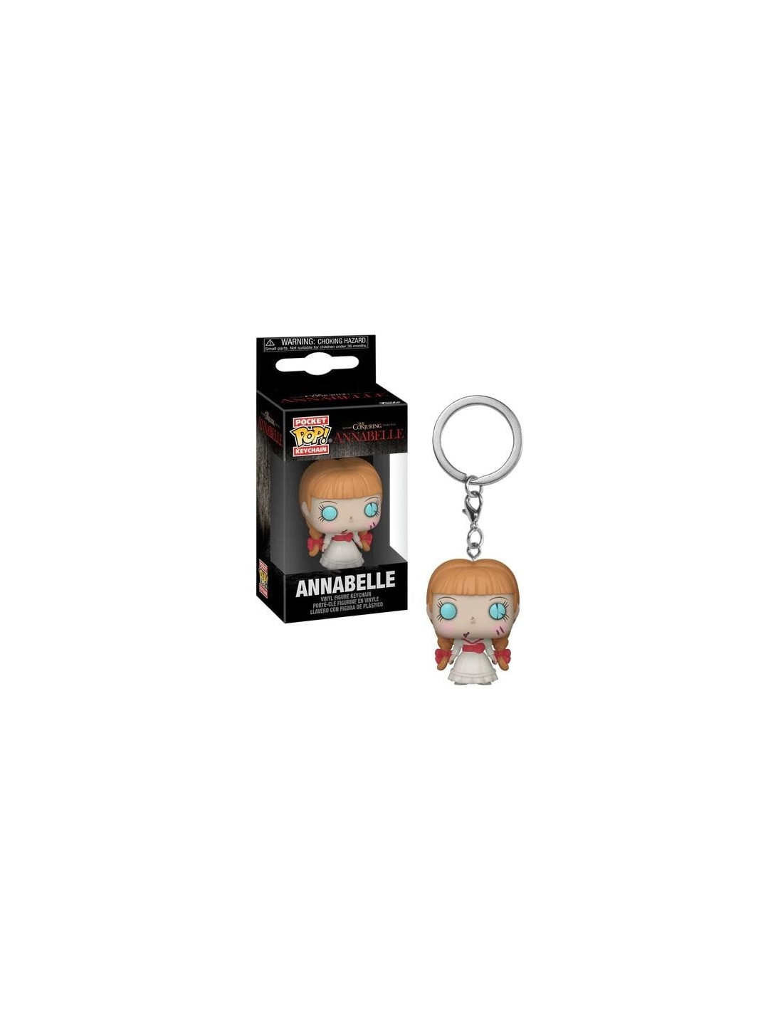 Annabelle. Llavero de la marca Funko Pocket Pop! · Formado por una anilla metálica y una figura fabricada en vinilo con una cabeza de tamaño desproporcionado como principal rasgo distintivo. · Mide unos 4 cm. de altura aproximada. · Se entrega en una caja de cartón y plástico rígido transparente. · Con licencia oficial de ANNABELLE.