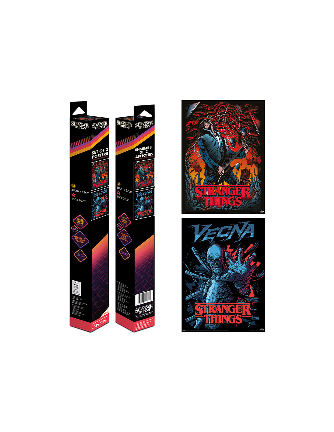 Pack de 2 pósters de 38x52 cm de papel laminado de alta calidad. · Laminación en brillo de 170g/m2 · Los diseños son exclusivos en posters. · Se presenta en caja de cartón con ranura para ser colgado en el punto de venta. · Con licencia oficial de STRANGER THINGS . · Producto de Pyramid