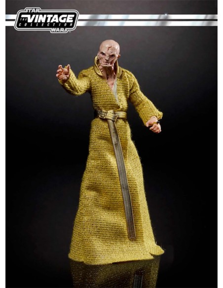 Hasbro presenta dentro de su colección Star Wars Vintage la figura del Líder Supremo Snoke tal y como aparece en el Episodio 8 de la saga Star Wars "Los Últimos Jedi". La figura es articulada y está hecha en PVC y mide unos 10 cm.