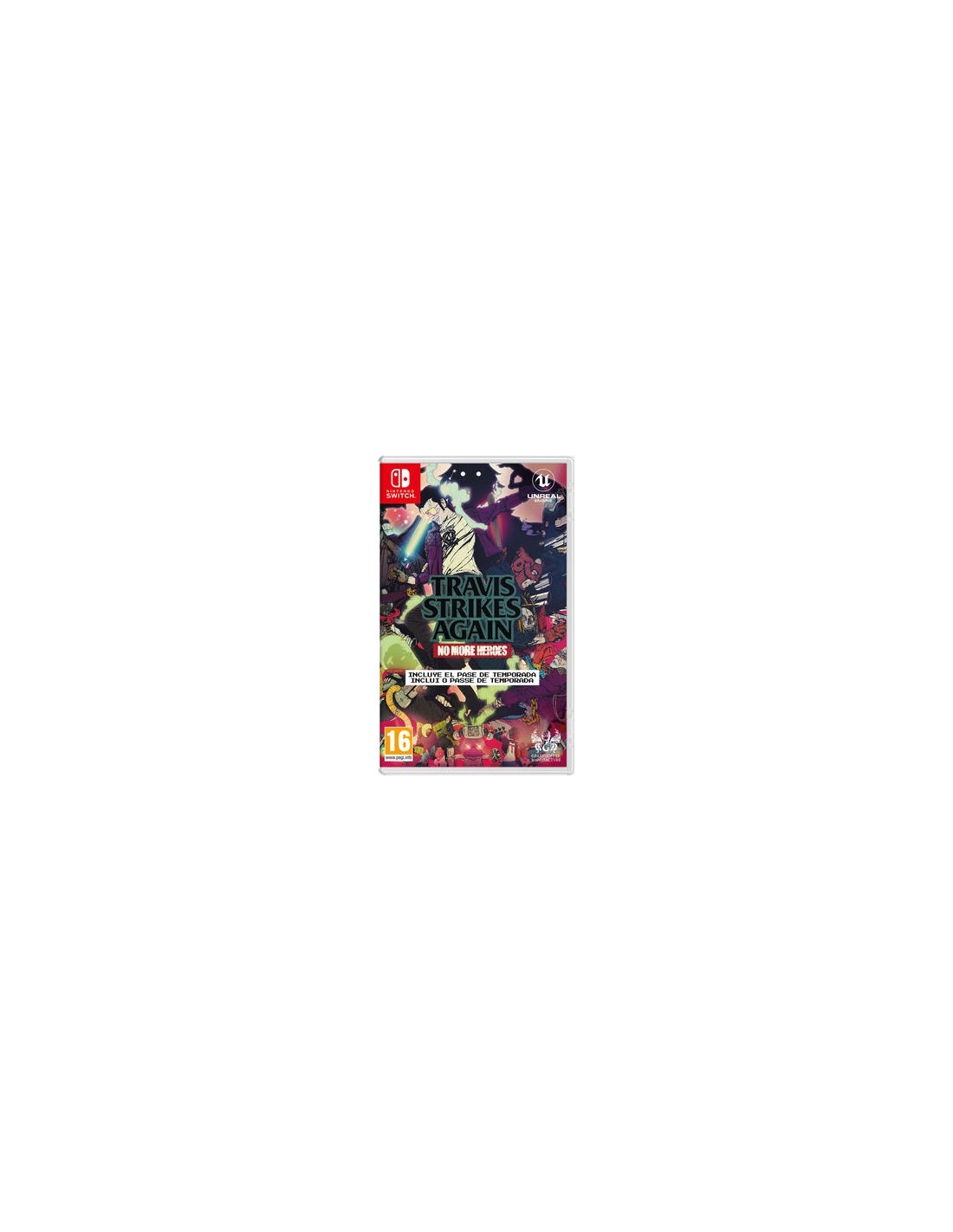 Travis Touchdown se adentra en el mundo de los videojuegos y emprende una masacre de proporciones épicas en Travis Strikes Again: No More Heroes para Nintendo Switch Dentro hay juegos de acción, de carreras, de puzles; un total de siete juegos diferentes Con su Beam Katana en mano, se propone exterminar hasta el último de los Bugs en su camino Pásale un mando Joy-Con a un amigo para jugar en el modo multijugador cooperativo y forma equipo con el único e irrepetible Badman En Adventure Mode se cuenta una nueva historia