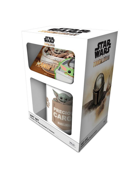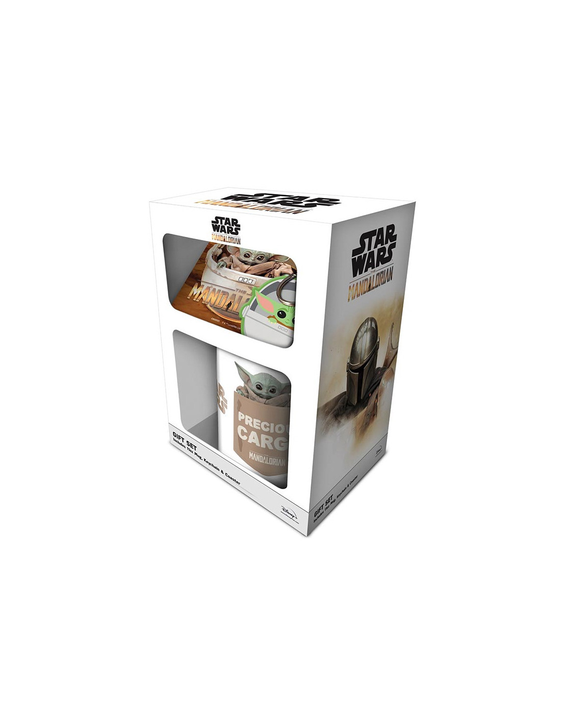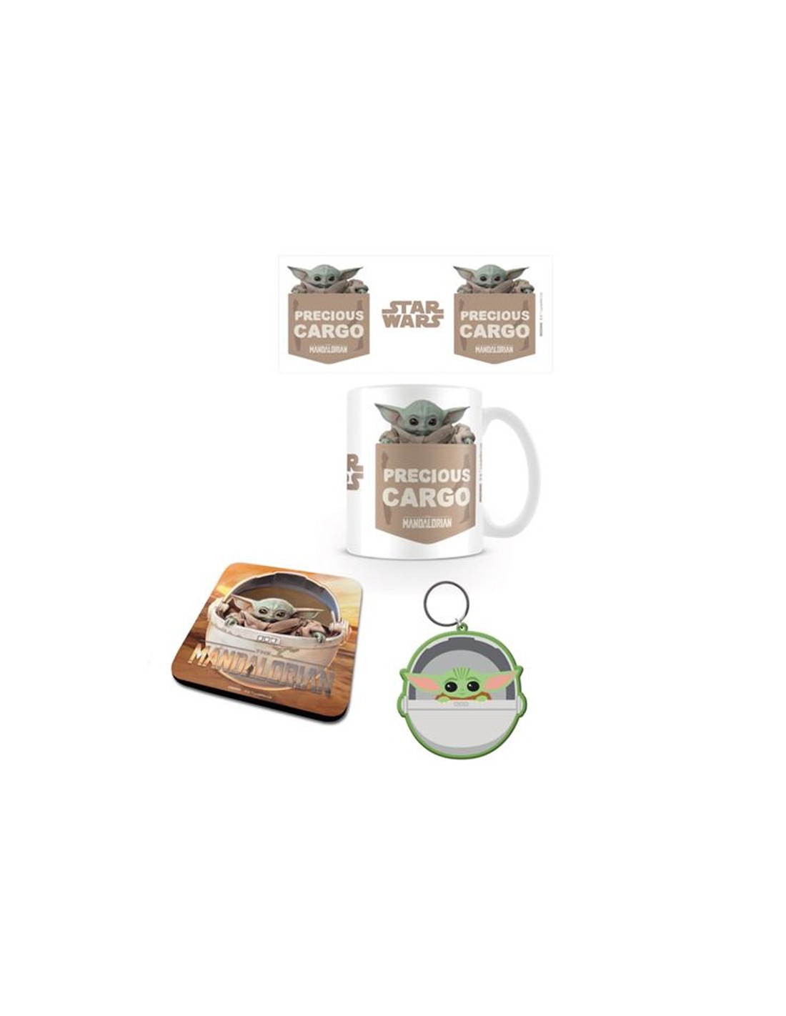 Pack formado por: 1. Taza de cerámica con asa con capacidad para 315 ml. 2. Llavero de goma con anilla metálica. 3. Posavasos de 10 x 10 cm fabricado con corcho. · Se entrega en una caja de cartón con dos oberturas que permiten ver los tres elementos. · Con licencia oficial de STAR WARS