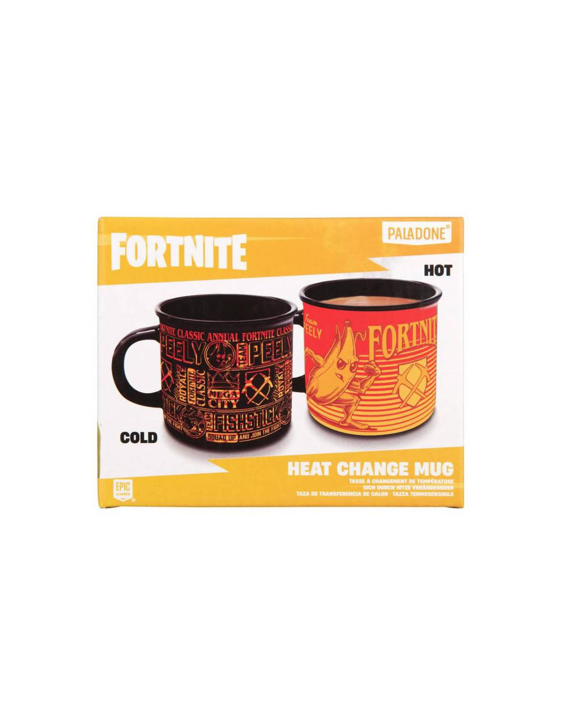Disfruta de tu bebida favorita con esta taza de cambio al calor de Fortnite. Este producto con licencia oficial transforma su diseño al contacto con el calor, revelando imágenes vibrantes de los icónicos personajes y logotipos de Fortnite. Cuando está fría, muestra un diseño oscuro con detalles naranjas y rojos de Team Peely y Team Fishstick. Al llenarla con una bebida caliente, se transforma para mostrar a Peely y Fishstick en todo su esplendor.