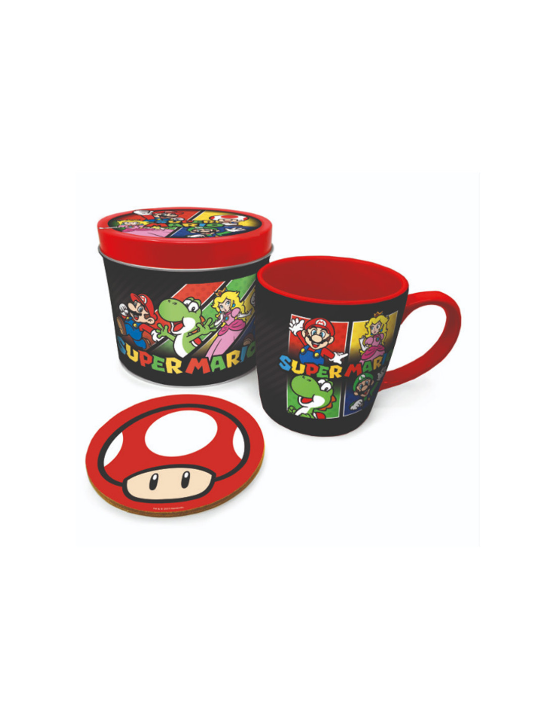 Pack formado por: 1. Taza de cerámica con asa con capacidad para 315 ml. 2. Posavasos de 10 x 10 cm fabricado con corcho. · Se entrega en una lata decorada. · Con licencia oficial de SUPER MARIO . · Producto de Pyramid.