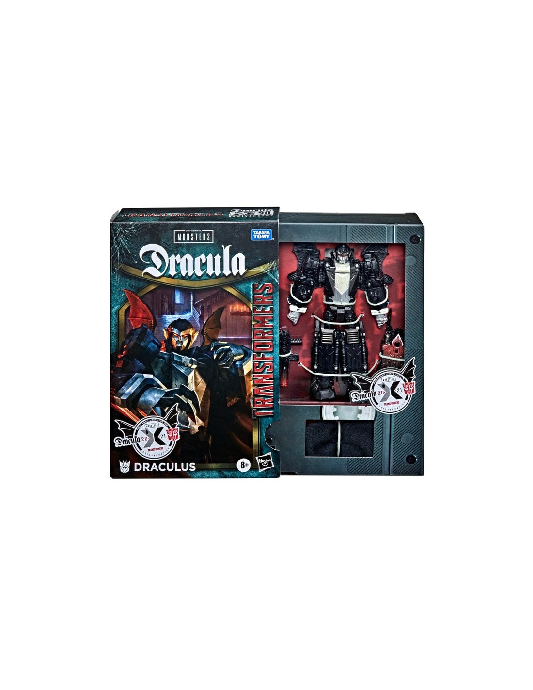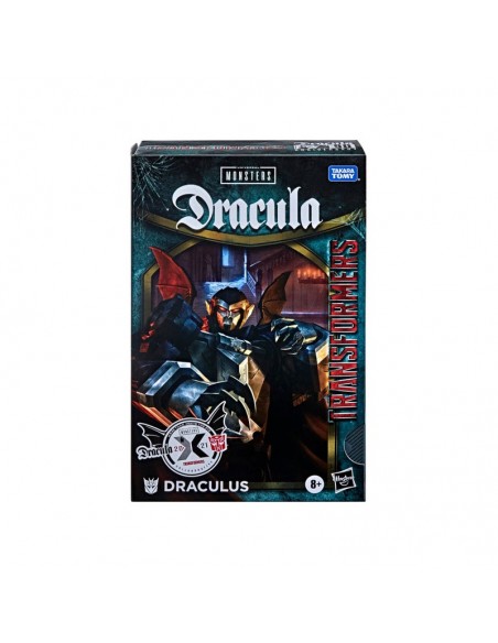Los robots Transformers siempre han sido mucho más de lo que se ve a simple vista. Ahora, con la línea Transformers Collaborative, los fans pueden disfrutar de personajes increíbles que se juntan, se mezclan y se unen con otros personajes, grupos e individuos que comparten la misma calidad especial. ¡Mundos chocan en este empaque de Transformers-Dracula mash-up! ¡El misterioso conde Drácula asume una nueva forma como el robot Transformers llamado Draculus! Estamos enfrentando a un muerto viviente... ¡un muerto viviente Decepticon! Draculus despierta de su estasis en las tinieblas de la noche para alimentarse del energón de los seres vivientes. La figura Draculus está inspirada en el vampiro de la película de Universal Pictures de 1931, Drácula. La figura se convierte en murciélago en 23 pasos. La figura cuenta con detalles inspirados en la película de Drácula, incluyendo diseño blanco y negro como la película original. Viene con capa, rifle y garra empaladora.