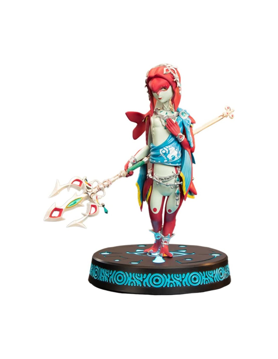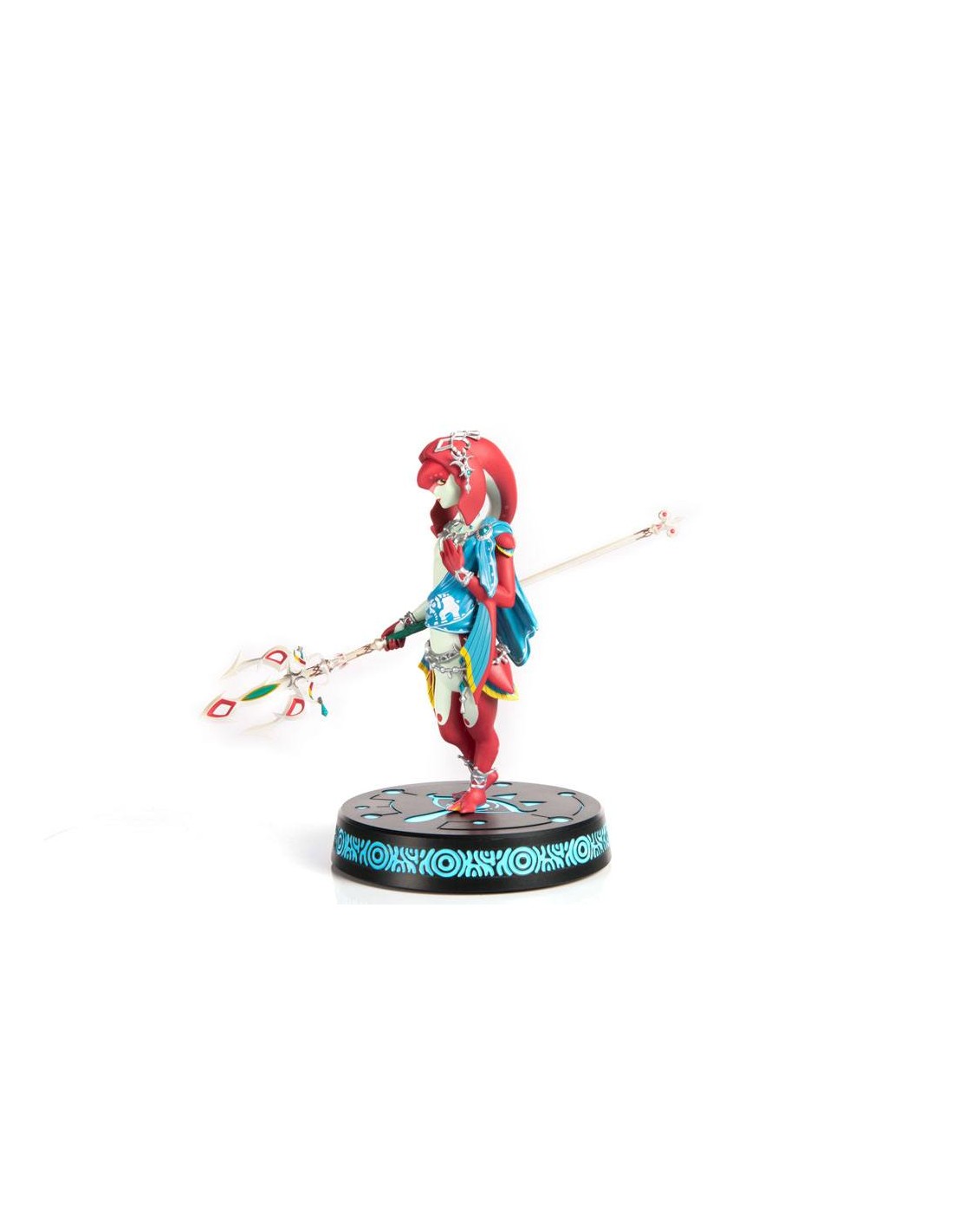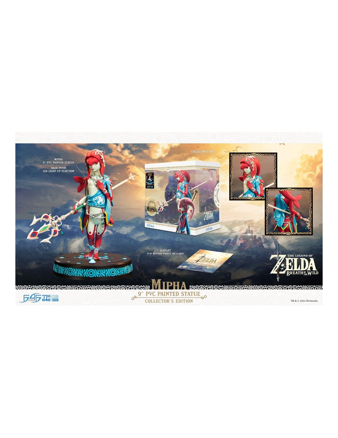 First 4 Figures se enorgullece de presentar su último coleccionable de PVC, la estatua de Mipha de The Legend of Zelda: Breath of the Wild. La detallada estatua de PVC de Mipha está inspirada en la obra de arte oficial de The Legend of Zelda: Breath of the Wild. Mipha se para en una pose gentil con su mano suavemente presionada sobre su pecho; su otra mano empuñando el Lightscale Trident. El diseño de la base se basa en el símbolo del ojo de la tribu Sheikah que aparece al activar la interfaz Sheikah Slate, y la edición de coleccionista de esta estatua viene con funciones LED brillantes para la base.